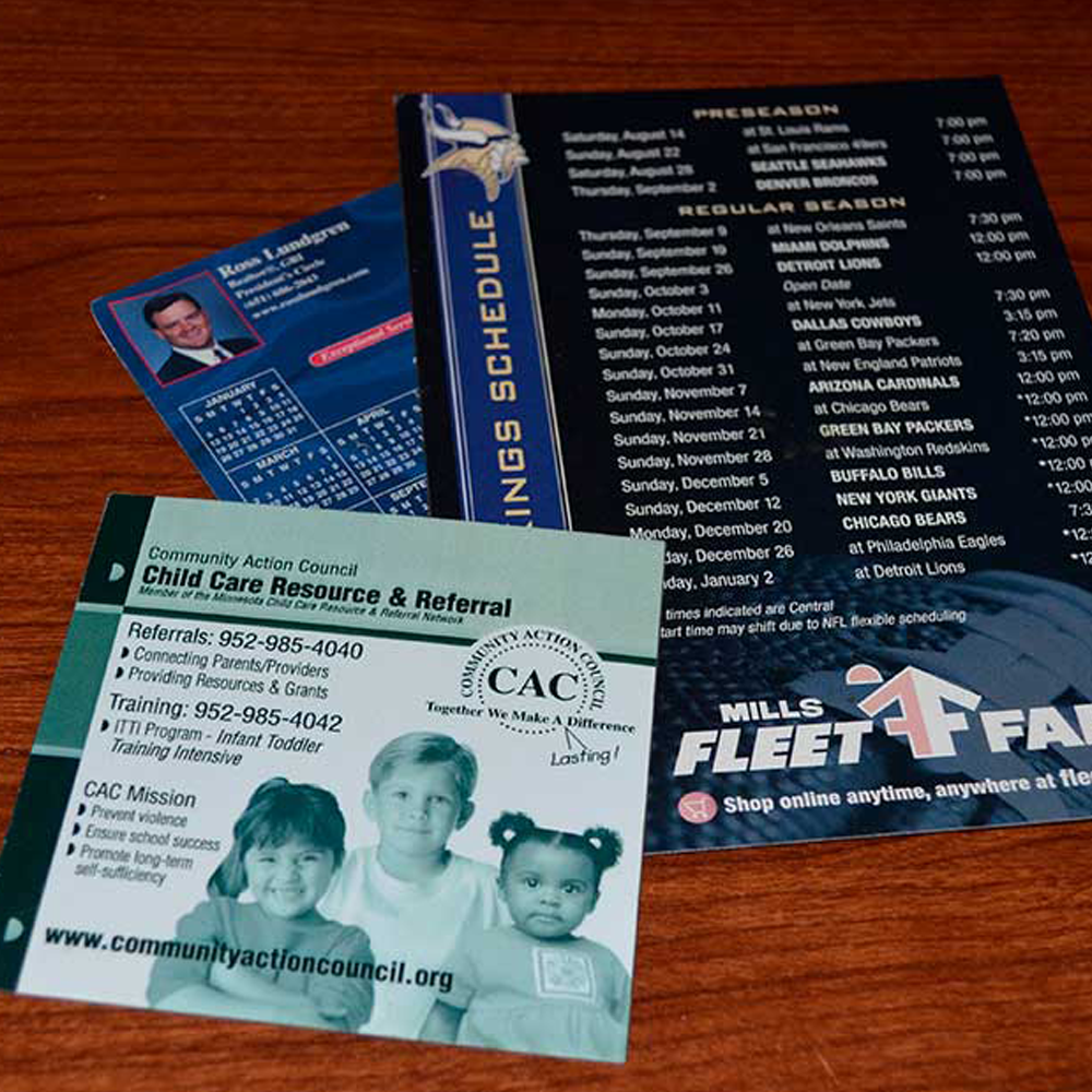 Our team can help you make your custom magnet truly unique and eye catching. We can work with you to include your own photos, your company logo, or make your own custom design a reality. We can make all shapes and sizes of magnets to fit your needs, including magnetic business cards or calendars. Just ask us!